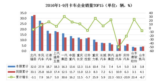 1-9月,前十五企業(yè)銷(xiāo)量排名中,北汽福田位居第一名,銷(xiāo)售32.0萬(wàn)輛,同比下降3.1%;其中,金杯汽車(chē)銷(xiāo)量下滑較大,同比下降50.3%。