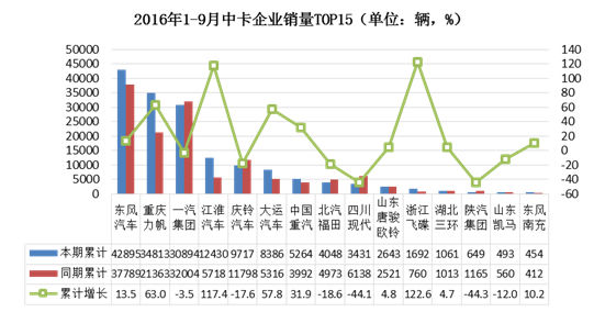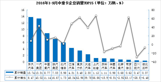 2016年1-9月中重卡企業(yè)中,東風(fēng)汽車(chē)銷(xiāo)量排名第一,累計(jì)銷(xiāo)量達(dá)到13.74萬(wàn)輛,同比增長(zhǎng)8.47%;銷(xiāo)量前十五企業(yè)中,重慶力帆、上汽紅巖和南京徐工銷(xiāo)量增長(zhǎng)較大,增幅均超過(guò)60%。
