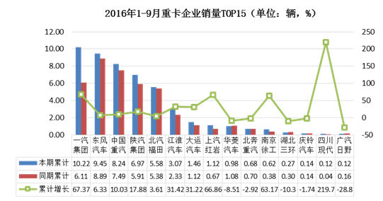 1-9月,重卡企業(yè)銷(xiāo)量前十五名中,一汽集團(tuán)銷(xiāo)售10.22萬(wàn)輛,同比增長(zhǎng)67.37%;四川現(xiàn)代企業(yè)銷(xiāo)量增幅明顯,同比增長(zhǎng)219.7%。