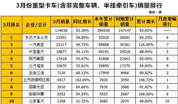 3月份,東風以384輛的微弱優(yōu)勢取代一汽奪得月度銷量冠軍;月度增幅最高的則是上汽依維柯紅巖,達到了162.04%。(具體排名如上)